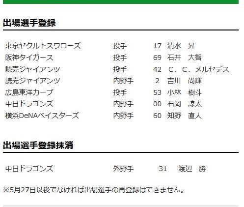 公示(登録・抹消・その他) 【DeNA】8月14(日)公示、高城・細川が登録、知野が抹消